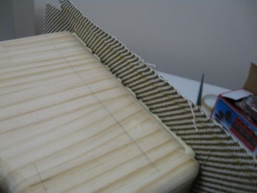 両サイドのツィードを折り返す。 ツィードは意外に硬い。 だから折り返したら押さえないとすぐに起きあがってしまう。 で、作業の進度も一気に遅くなる。 言い訳してないで、作業作業! まず、丸めた角の所が浮くとかっこ悪いので、接着剤を流す。 その後、…
