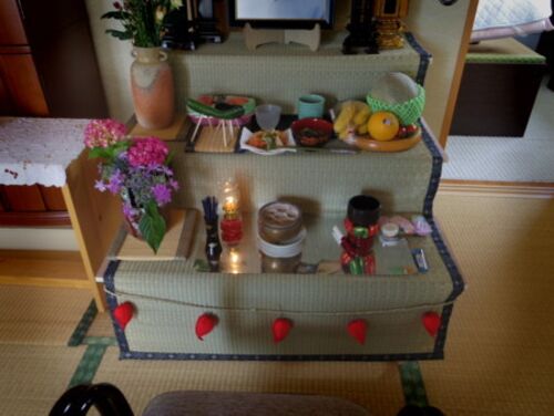 伊香保のお盆は7月。 盆棚を作る。 昔、母の実家では私の祖父が作っていた。 真四角の棚で周囲に竹を立て、縄を張り、キュウリとナスの馬と牛。 伊香保の実家は、葬儀のときの祭壇を流用している。 まぁ、それはそれで良いのではないか?